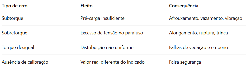 Um parafuso subapertado pode afrouxar durante a vibração, enquanto um sobreapertado pode romper ou deformar a rosca — ambos os casos resultam em falhas mecânicas, vazamentos e acidentes.