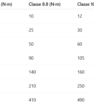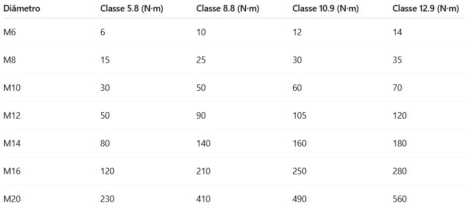 Tabela de torques recomendados (valores médios)